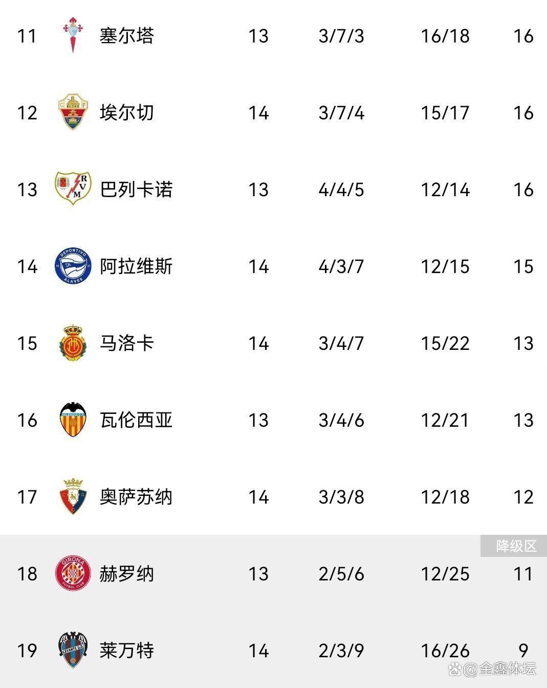 降级区方面,莱万特和皇家奥维耶多同积9分,深陷降级泥潭。 赫罗纳积11分,奥萨苏纳积12分,也面临着不小的保级压力。