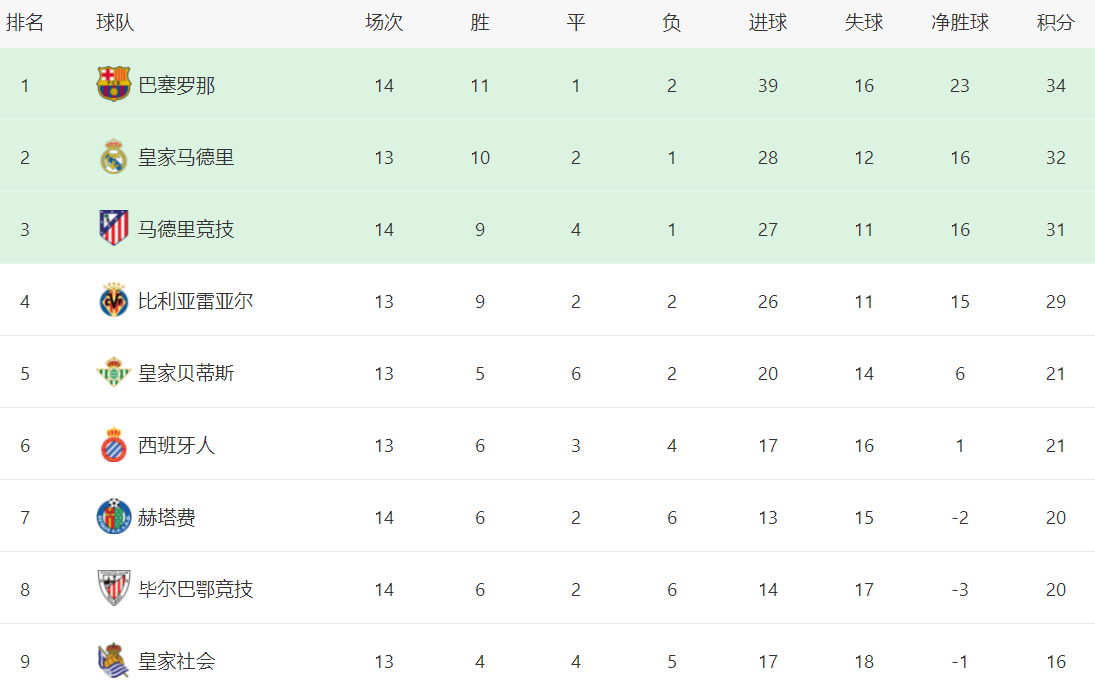 在积分榜上,巴萨以34分排名榜首。而32分的皇马掉到第2名。马竞赢球之后,总积分达到31分,升到第3名。前3的最大分差只有3分,竞争白热化。不过,皇马比巴萨和马竞少踢1场。如果接下来与赫罗纳的比赛获胜,皇马就能够重登榜首位置。比利亚雷亚尔以29分排名第4。第5的是皇家贝蒂斯,拿到21分。西班牙人也是21分,排名第6。返回搜狐,查看更多
