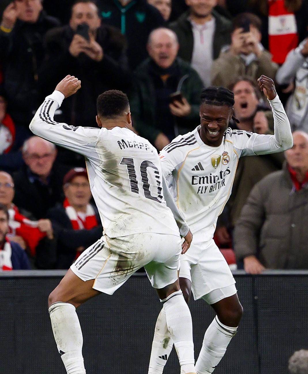 皇马的进攻浪潮没有停歇。毕尔巴鄂试图用反击回应,几次突击确实惊出库尔图瓦一身冷汗,但比利时门神高接低挡,力保城门不失。第42分钟,皇马在禁区前打出精妙配合,皮球经过几次传递后,姆巴佩在禁区右侧头球回点,卡马文加心领神会,一记冲顶将球砸进网窝。2-0,皇马的领先优势扩大。